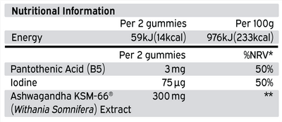 x Sweeteners (Maltitol, lsomalt), Water, KSM-66® Ashwagandha (Withania somnifera) Root Extract, Gelling Agent (Pectin), Acidity Regulators (Citric Acid, Sodium Citrate), Natural Flavourings, Calcium D-Pantothenate, Potassium Iodide, Colouring Food (Black Carrot Extract), Vegetable Oil (Coconut Oil, Glazing Agent [Carnauba Wax]), Sweetener (Steviol Glycosides from Stevia).